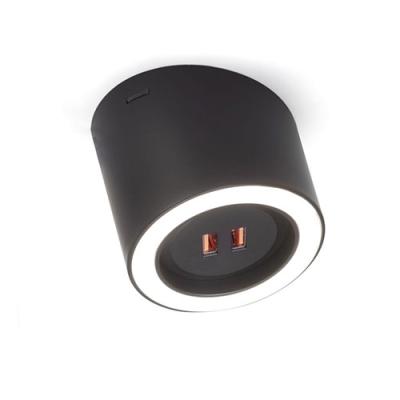 Aufbauleuchte. Kunststoffgehäuse, rund, Ausleuchtung ohne sichtbare LED-Punkte mit integriertem Doppel-USB Charger.