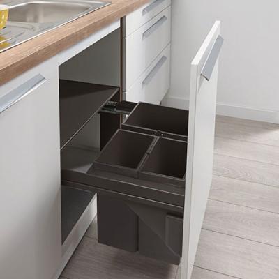 Ideal für größere Haushalte eignet sich das Abfalltrennsystem WESCO® Pullboy Soft Comfort 360 K/600-3. Es kann in Küchenunterschränke mit Frontauszug eingebaut werden und passt für Korpusbreiten von 600 mm. Gleich drei herausnehmbare Abfallbehälter bieten ein Gesamtvolumen von 33 Litern. Diese verteilen sich auf zwei kleine Container zu 8 Liter und einen größeren zu 17 Liter. Abgedeckt werden alle Behälter gleichzeitig durch das praktische Deckel-Auszugsystem. Es kann bei Bedarf aus dem Schrank gezogen und als vielseitige Ablage genutzt werden. Eine Antirutschmatte verhindert dabei ein Wegrollen der Utensilien. Dank Softeinzug und Dämpfung lässt sich das Abfallsystem komfortabel schließen. Die Montage erfolgt in der Seitenwand inklusive Verbindung zur Frontblende des Schranks.