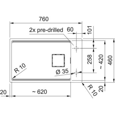 Mögliche Bohrungen für Armatur/Zubehör sind nur von unten angebohrt und müssen bauseits mit geeignetem Bohrer durchgebohrt werden. Bitte ggf. den Fragranitbohrer aus dem Sonderzubehör mitbestellen.